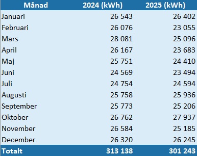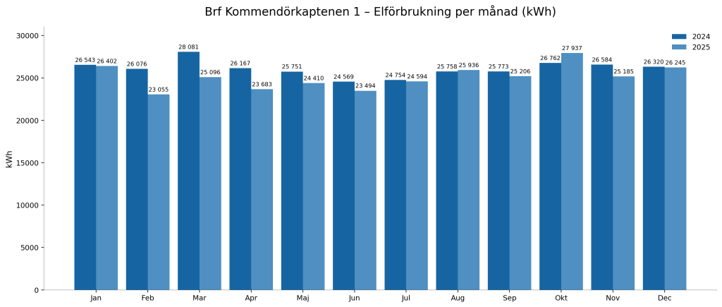 Brf Kommendörkaptenen 1 har under 2025 minskat sin förbrukning av fastighetsel jämfört med föregående år. Den totala elförbrukningen för fastighetsel var 11 895 kWh lägre än under 2024, vilket motsvarar en minskning på cirka 3,8 procent.